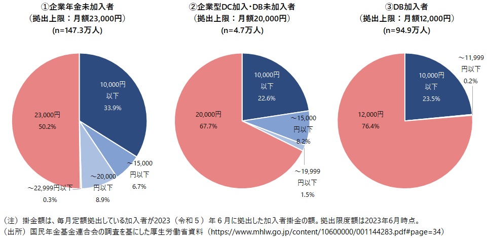 低・中所得者層の利用者にとっても、現状の拠出限度額は少ないようだ。図表5は会社員・公務員(国民年金第2号被保険者)による2023年6月分の掛金額の分布をみたものだ。iDeCoの拠出限度額は会社員・公務員の場合、企業年金の加入状況により3つのケースが設けられている。