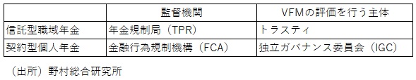 一方、契約型の個人年金については、金融行為規制機構(FCA)が規制を管轄。年金プロバイダーの設置する独立ガバナンス委員会(IGC)(注3)がVFMを評価し、年次報告で説明することを義務づけている。IGCは手数料・コスト、投資パフォーマンス、サービスの質の3つの要因について評価し、他のスキームと比較することが求められる。