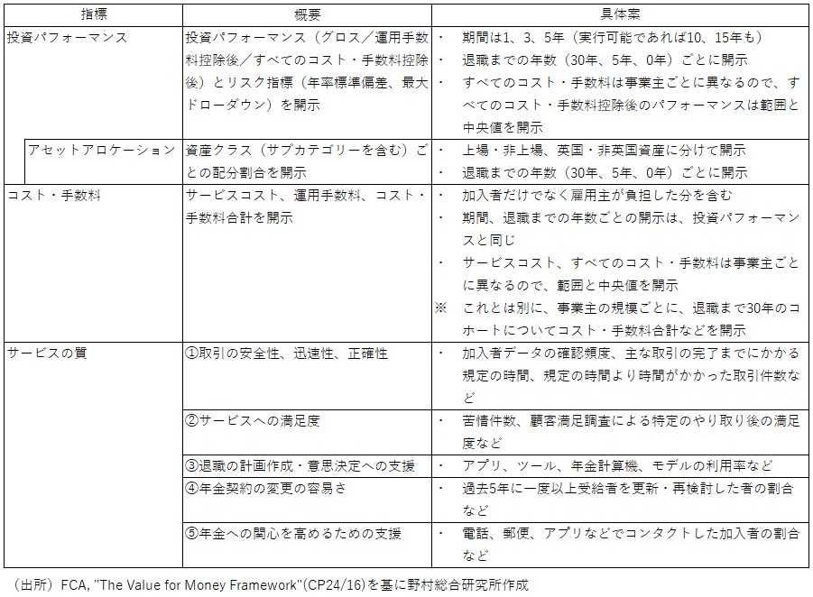 DC年金の価値の見える化を図るためにどのような共通の指標の公表を求めようとしているか、公表された指標の数字をどのようにVFMの評価の判断に結び付けようとしているかの議論は、わが国にとっても興味深い。以下では、FCAの提案からVFMフレームワークの概要を示し、3つの特色を指摘したい。