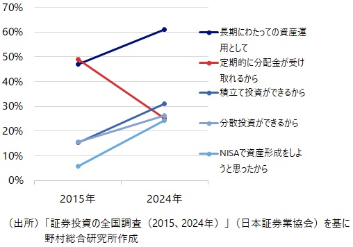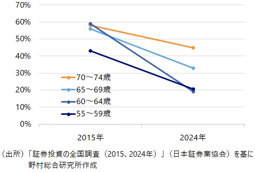 日本証券業協会の「証券投資の全国調査」によれば、NISA導入以降、長期・積立・分散投資を目的とした投資信託の購入は増加傾向にあるが、高齢者層においては依然として定期的な分配金の受け取りを重視する傾向が残っている。図表1は「投信の購入理由」のうち、その選択率が2015年から2024年までの間に10%以上変化している項目を抜き出したものだ。回答者全体では、NISAの利用をするためや長期・積立・分散投資に利用できるからとするものは10%以上増加し、一方、定期的に分配金が受け取れるからは49%から25%へ半減している。ところが、高齢層に限定すると、定期的な分配金受け取りを目的とする投信購入はそれほど、減少していない。図表2を見てわかるように「55~59歳」や「60~64歳」ではその割合は20%まで低下しているが、「65~69歳」では3人に1人、「70~74歳」では2人に1人と高止まりしている。このように65歳以上の層では、「定期的に分配金が受け取れる」ことを投資信託の購入理由とする割合が高く、リタイア後の生活におけるインカムニーズの強さを示唆している。