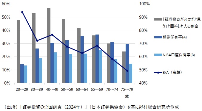 もっとも、高齢者層が保有する資金を貯蓄から投資にシフトさせるためには、単に毎月分配型投信をNISAの対象に加えるだけでは不十分と考えられる。図表3の折れ線グラフが示すように、証券口座保有者に占めるNISA口座の保有者の割合は、高齢者層は他の世代と比較して低い水準にある。このため、毎月分配型投信がNISAの対象に加わることにより、65歳以上における証券口座保有者に占めるNISA口座の保有者の割合を40代並みに引き上げることができれば、NISA口座数は増加するはずだ。しかし、その数は260万件程度に過ぎない。これ以上のNISA口座数の増加を目指すためには、高齢者層において証券投資への意欲を高めることが必要だが、それは容易でない。「金融資産を増やすために証券投資が必要だ」と考える人の割合は、65歳以上では、実際に証券口座を保有している人の割合を下回っている。これは、高齢者層の投資を促進させるためには、その必要性の理解の浸透が必要なことを意味している。