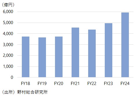 公募投信の有価証券報告書や運用報告書および純資産残高データに基づき、資産運用会社が得た運用報酬(信託報酬のうち運用会社の受取分)を推計した。その結果、公募投信全体の運用報酬は、2018年度の3,727億円から2024年度には5,926億円へと、6年間で約1.6倍に拡大したことが確認された(図表1)。