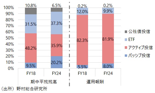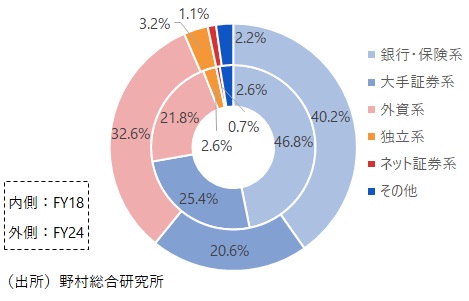 この「残高と収益のジレンマ」を背景に、運用会社タイプ別の運用報酬シェアは過去6年間で大きく変化した(図表3)。最も顕著なのは外資系運用会社(注1)のシェア拡大である。2018年度に21.8%であったシェアは、2024年度には32.6%へと10.8%ポイント上昇した。これにより、外資系は大手証券系(注2)を上回り、銀行・保険系(注3)に次いで業界第二位のシェアを占めるに至った。