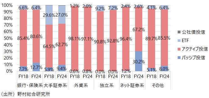 この期間で顕著な戦略転換が見られたのがネット証券系である。グループの販売力を活用した低コスト戦略を展開し、低コストのパッシブ投信を主力商品として急速に残高を拡大させた。その結果、パッシブ投信の報酬シェアは1.2%から30.2%へと急増した。アクティブ投信においても、他のタイプの運用会社より平均報酬率を低く設定しており、販売チャネルをグループ内に絞ることで低コスト構造を実現している点が特徴である。