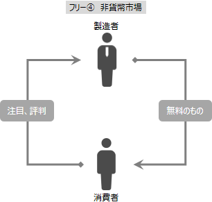 最後が非貨幣市場である。これはちょっとわかりにくいが、ようは金銭的なやり取りを行わずにモノやサービスがやり取りされる市場を指している。代表的なものでは「贈与経済」がこのような市場に当てはまる。Webの世界でいえばWikipediaを編集する人たちはこのような非貨幣市場で活動していることになる(最近は運営費のコストを賄うために寄付を募ったりしているが)。この非貨幣市場でモノやサービスを提供する動機として、一つは利他主義があるだろうし、もう一つは注目や評判といった無形の「報酬」が挙げられるだろう。