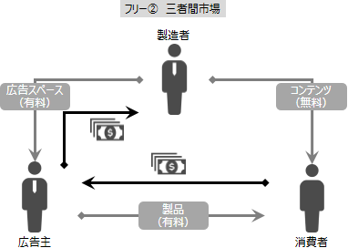 これはテレビ放送をイメージしてもらうのが一番手っ取り早い。視聴者(消費者)はタダでコンテンツ(番組)を視聴できるが、コンテンツには広告が含まれている。コンテンツを制作するためのコストは広告主が負担する。一方、広告主はコンテンツ制作費を含めた価格で製品を消費者に売ることで、コンテンツ制作費をカバーする。
