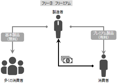 - 実際、「無料」でサービスを提供しているビジネスモデルは「②三者間市場」がほとんどであり、純粋な意味での「③フリーミアム」モデルは稀である。。