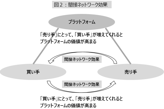 このような「買い手」と「売り手」といった市場をつなぐ場合、双方の市場の間で相互作用が起きる。それが「間接ネットワーク効果」である。例えば、テレビ番組を考えてみる。この市場の「買い手」は視聴者の市場である。もう一方の「売り手」市場は、コンテンツとなるテレビ番組を制作し、そこに広告を組み込む「広告主」である。この場合、「売り手」である広告主は潜在的な買い手である視聴者の数(端的にいえば視聴率)を気にするだろう。一方で、「買い手」である視聴者は話題の番組は職場の話題にもなるから見逃したくないと思うかもしれない。このように、両面市場では一方の市場での「人気(需要)」が、もう一方の市場(この場合では「広告枠」という市場)に作用する。見る人(買い手)が増えれば、広告費(売り手)も増えるという関係が成立するのである。このような異なる市場間での相乗効果を「間接ネットワーク効果」と呼ぶ(図2)。