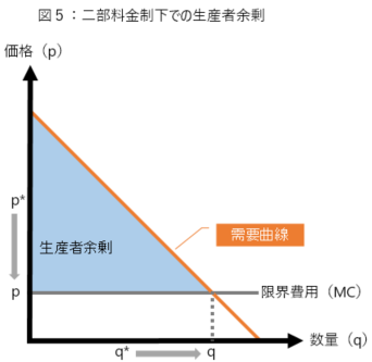 さて、仮に企業が価格を限界費用(MC)と同じ価格pに引き下げ、その代わりにqの量を消費したのと同じ金額を「固定料金」で徴収する場合を考える。その時消費者は価格がpまで下がるので、消費をqまで増やす。しかし、企業はその分の料金を「既に手に入れている」ので、需要曲線と限界費用の間の余剰をすべて受け取ることができるのである。これを示したのが図5である。独占価格q*で得られていた青い四角形の生産者余剰が、大きな青い三角形に増加していることに注目してほしい。