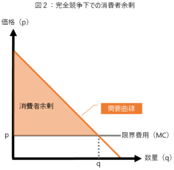 そして、もう一つ。市場で財が取引された場合、取引は社会的により効率的な状態をもたらしているはずである。その「より効率的になったはずの何か」を「余剰」と呼ぶ。取引の結果、消費者(買い手)が得た「よりよい何か」を消費者余剰と呼び、企業(売り手)が得たほうを「生産者余剰」と呼ぶ。図1は完全競争下での価格と供給量を示している。この場合価格pは限界費用(Marginal Cost:MC)と等しくなり、その時の生産量qは需要曲線と限界費用が交わる点に決まる。そしてこのときの消費者余剰は限界費用(企業の売り価格)と需要曲線の間にある三角形と等しくなる(図2)。