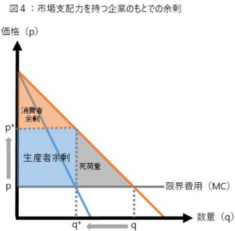 そして、この独占価格p*と調整された生産量q*の取引の結果、図4に示すように消費者余剰はオレンジの三角形に減少し、一方で企業は青い四角形の生産者余剰を得ることができる。また、生産量が減り、価格が上昇したことで完全競争下では実現していた取引量が満たされないため、「得られたはずの何か」が減少する。それがグレーの三角形で示されている「死荷重(Dead Weight Loss)」である。これは市場支配力を持つ企業によって市場取引から失われた余剰である。
