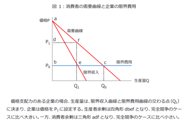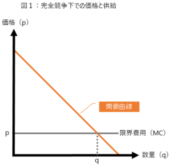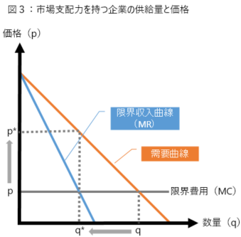 一方で、市場支配力を持つ企業は異なった価格戦略を取れる。それが図3だ。ここでは先程と異なり、青い線が新たに登場している。これは「限界収入曲線(Marginal Revenue:MR)」と呼ばれるもので、企業が利潤を最大化できる生産量を示す曲線である。このように市場支配力を持つ企業の場合、生産量は完全競争下でのqではなく、限界収入曲線と限界費用が交わる点q*に減らすことが最適となる。そして、その時の価格(「独占価格」と呼ぶ)は、完全競争下でのpから、p*に上昇する。