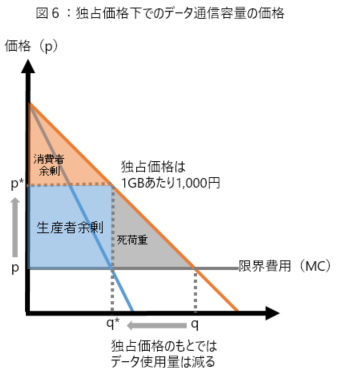 最初に「独占下での価格(p*)」はいくらかを確認しておこう。これは追加でデータ容量を買う「データチャージ」の料金を見ればわかる。auのデータチャージの料金は「1GBあたり1,000円」となっている。これは図6の「p*」に当たる価格である。このときの需要は「q*」となり、その際の消費者余剰と生産者余剰は図6の通りである。