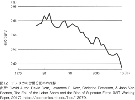 また、労働分配率は80年代から低下を続けている(図I.2)。