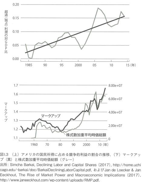 この労働分配率は国民所得における賃金の割合を示したもので、これは工場労働者の賃金から高額の報酬を受け取るCEOまでのすべての労働者が受け取った賃金が対象だ。つまり、労働の成果が労働者に渡らず、企業に渡っている可能性が高い。実際、図I.3の上では、アメリカの企業の「超過利潤(=独占力から得られた経済的利益)」の比率が年々拡大していることがわかる。また図I.3の下の図は、そういった超過利潤を得ている企業の収益力、いわゆる価格のうちコストに上乗せして得ている利潤である「マークアップ」の推移と、企業の株式の時価総額を比較したものだが、両者の間に強い相関が見て取れる。つまり、労働の成果は労働者に分配されず、また企業は超過利潤を得られるような独占的な市場を形成しており、最終的にそれらの富が一部の超富裕層に吸い取られていることを示している。