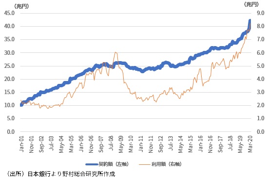 さらに、3月以降に際立ってきたのが、銀行が企業に対して一定の期間、一定の融資枠を設定するコミットメントライン契約の増加である。3月のコミットメントラインの契約額は、前月と比べて0.9兆円、4月はさらに2.9兆円と急増している(図)。4月の契約額は前年同月比で+20.3%と、2002年以来の高い増加率となった。10年前のリーマンショック時よりも、コミットメントライン契約を通じた企業の資金確保の動きは格段に強い。これは、将来の資金繰り維持に対する企業の強い不安を反映しているだろう。