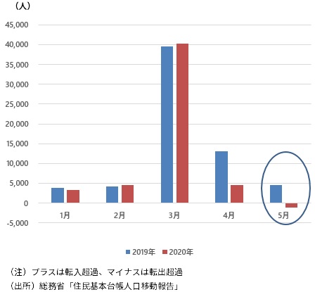 2020年5月の東京都の人口転入・転出の動向をみると(住民基本台帳人口移動報告)、転入、転出ともに前年同月比で大幅な減少となった。その結果、転出者が転入者を1,069人上回り、ネットで転出超過となっている(図表1)。これは、外国人を含む移動者数の集計を始めた2013年7月以来初めて、日本人に限っても東日本大震災の影響があった2011年7月以来初めてのことである(注)。