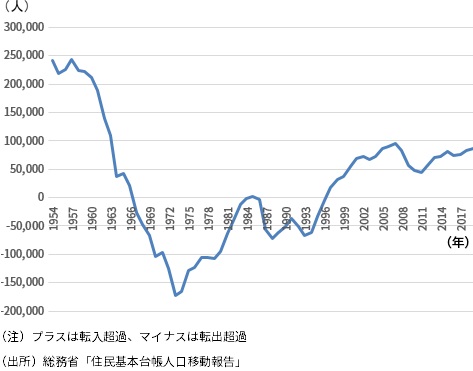 男女別にみると、過去10年程度は女性の純流入(転入超過数)が多いことが分かる。他方で女性の転出者数は少ないことから、女性は一度東京に転入すると地元に戻らない傾向があるとも言える。