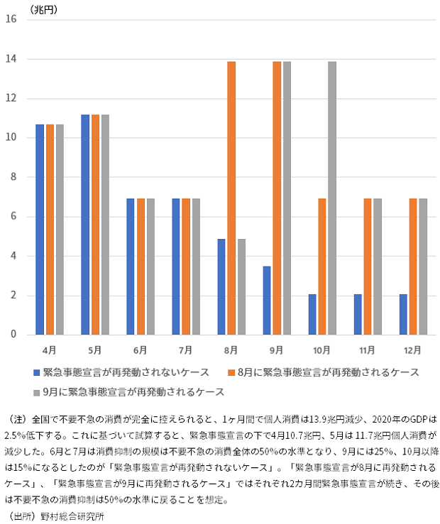 以上のベースケースに対して、「緊急事態宣言が8月に再発動されるケース」、「緊急事態宣言が9月に再発動されるケース」の2つのケースを想定しよう。
