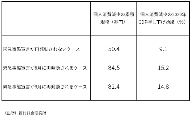 共に、全国レベルで2か月間緊急事態宣言が続くもとで、不要不急の消費は完全に控えられ、その後は年末にかけて不要不急の消費は50%抑制されることを想定している。
