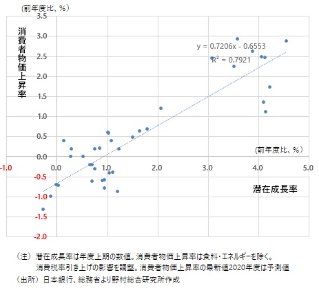 潜在成長率と消費者物価上昇率の相関関係は高い(R2=0.79)。潜在成長率が1%低下すると、消費者物価上昇率は0.72%低下するという関係がある。そして、足もとで既に物価上昇率はマイナスとなっているが、潜在成長率が2020年度上期に前年同期比-0.01%となったもとでは、過去の傾向も踏まえた消費者物価上昇率の妥当水準は、前年度比-0.7%程度となる。