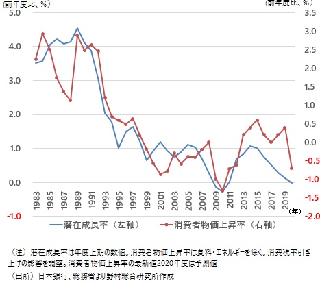 日本銀行は、コロナショックを受けた需給ギャップの悪化で物価上昇率は一時的に下振れしている、と説明しているが、この先、需給ギャップが改善していく場合でも、コロナショックを受けて潜在成長率がゼロ近傍に低下した状態が定着すれば、消費者物価上昇率の基調はやはりマイナスが定着することになる。