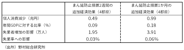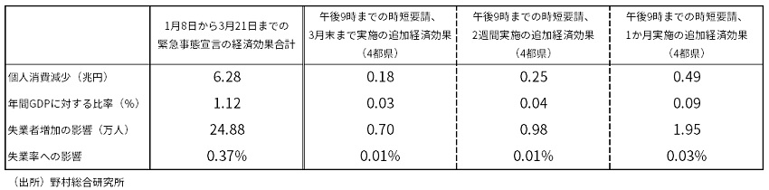 ちなみに、まん延防止措置導入の場合の経済効果は、過料の違いに基づいて、緊急事態宣言の3分の2と考えた(コラム「 緊急事態宣言再延長か、まん延防止措置に移行か 」、2021年3月15日)。さらに、法的根拠を持たない今回の午後9時までの飲食店への時短要請の経済効果は、まん延防止措置の50%と想定しよう。
