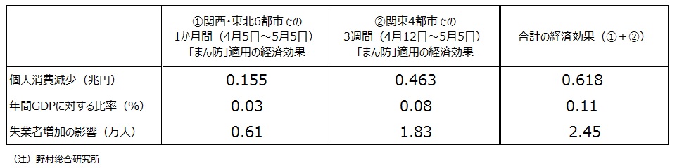 関西・東北6都市で「まん防」が1か月間適用された場合、経済損失(個人消費の減少)は1,550億円程度と推定される(図表)。これは年間GDPの0.03%程度の規模である。また、失業者はそれによって6,100人程度増加する。