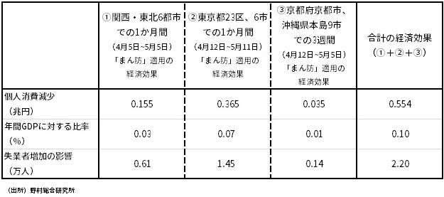 それによると、東京都23区・6市でのまん延防止措置適用は、日本全体のGDP(個人消費)を3,650億円減少させる。また、京都府京都市、沖縄県本島9市での適用は、日本全体のGDP(個人消費)を350億円減少させる。先行する関西・東北6都市での1,550億円と合わせると、5,540億円となる。これは、1年間の名目GDPの0.1%に相当し、失業者を2万2千人増加させる計算となる(図表1)。