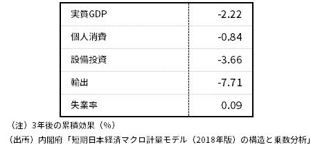 内閣府の「短期日本経済マクロ計量モデル(2018年版)」を用いたシミュレーションによると、上記のような経路などを通じて、経済には大きな打撃が生じることが分かる。ドルが対円で30%下落する場合には、3年間での累積効果で、実質GDPは2.2%も下落する計算だ。中でも、円高で国際競争力を低下させる実質輸出は、7.7%の大幅下落となるのである(図表)。