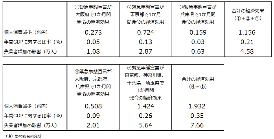 また、大阪府に加えて、東京都、兵庫県の3都府県に1か月間の緊急事態宣言が発令される場合には、合計で1兆1,560億円(年間GDP比0.21%)の経済損失が生じる計算だ。また、その場合、失業者は4.58万人増加する。