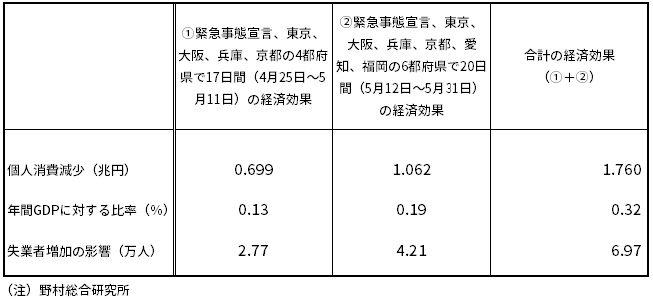 5月11日までの宣言との合計でみると、経済損失は1兆7,600億円(1年間の名目GDPの0.32%)、失業者数を追加で7.0万人増加させる計算となる。