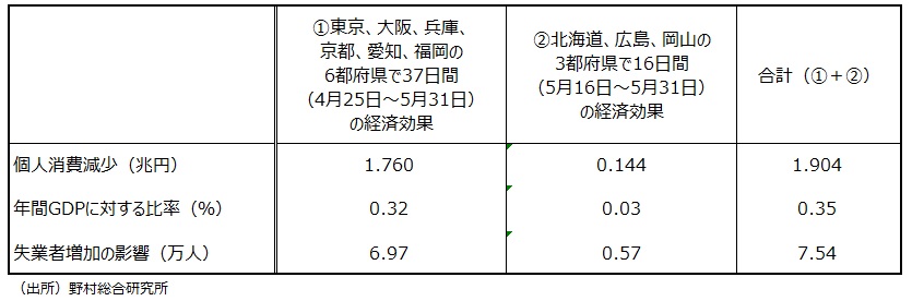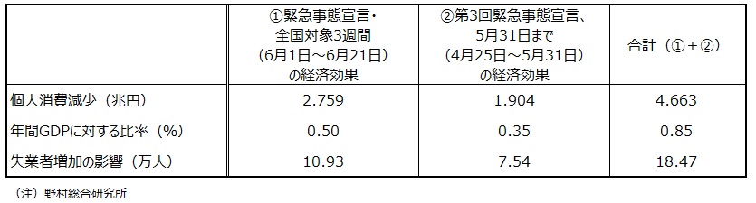 そこで、9都道府県での宣言が5月31日まで続いた後に、全国を対象とする宣言がさらに3週間続けられるケースを想定してみよう。5月31日までの宣言の効果との合計でみると、経済損失額(個人消費減少額)は、4兆6,630億円と推定される。これは1年間の名目GDPの0.85%に相当し、失業者数を18.5万人増加させる計算となる(図表2)。