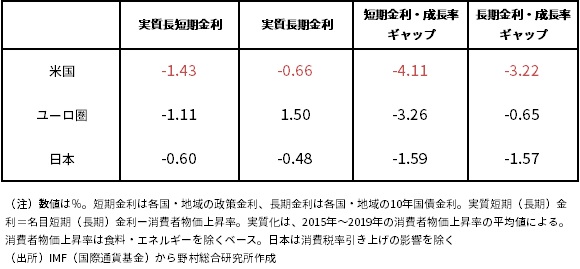 他方、金融緩和の効果は、「実質金利」と潜在成長率に近似すると考えられる、需給ギャップに中立的な「自然利子率」との差で決まる、との考え方もある。そこで、実質長・短金利と実質成長率のトレンドとの差(ギャップ)にも注目しても、米国の緩和状態が最も強いことが明らかとなる。