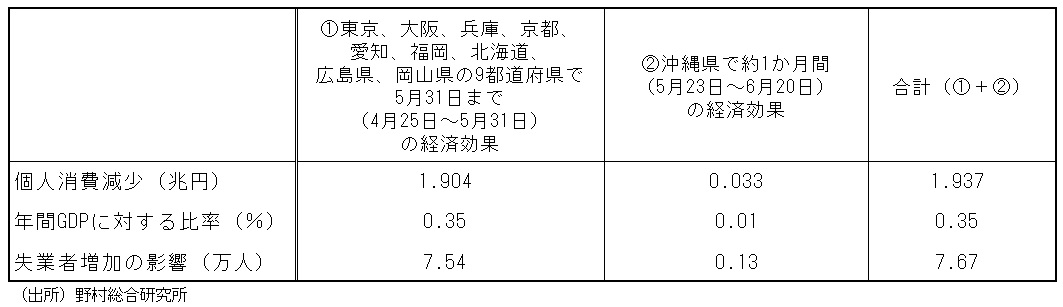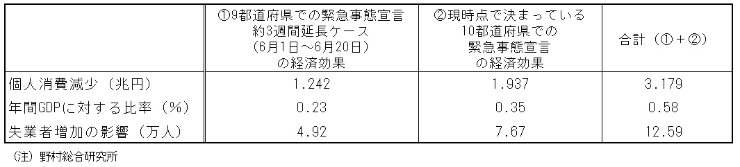 既に宣言の対象となっている9都道府県での5月31日までの経済損失と合計すると、1兆9,370億円、名目GDP比0.35%となる。これは、失業者数を7万6,700人増加させる計算となる。