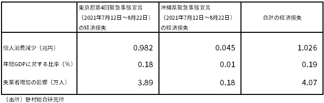 他方、沖縄県での緊急事態宣言による経済損失は450億円となる。両者を合計した経済損失は1兆260億円と1兆円を超える。これは、年間GDPの0.19%に相当し、失業者を4.1万人増加させる計算だ。