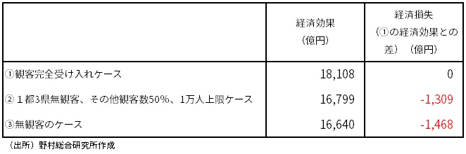 その場合、チケット購入や関連する消費(交通費、宿泊費など)の合計が、1,309億円減少する。観客数はフルに受け入れた場合の東京五輪開催の経済効果1兆8,108億円は、1兆6,799億円に7.2%減少する。