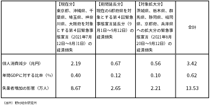 この延長措置により、第4回緊急事態宣言による経済損失は0.67兆円増加し、また対象区域の拡大措置により、経済損失は0.56兆円増加する計算だ。現時点での宣言と合計すれば、第4回緊急事態宣言による経済損失は3.42兆円となる(図表1)。これは年間の名目GDPの0.62%に相当し、失業者を13.5万人増加させる。