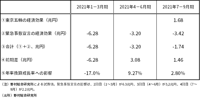 しかし、その経済損失の規模は4-6月期に実施された第3回緊急事態宣言の3.2兆円とほぼ同額となる。さらに、これに東京五輪の経済効果が加わる。そのため、東京五輪と緊急事態宣言の影響のみを取り出して計算すると、それらは7-9月期の実質GDP成長率を前期比年率+2.8%押し上げる計算となる(図表2)。