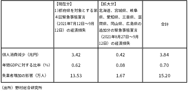 今回の拡大措置が実施されると、第4回緊急事態宣言による経済損失は4,200億円増加する計算だ。現時点での対象分と合計すれば、第4回緊急事態宣言による経済損失は計3.84兆円となる(図表1)。これは年間の名目GDPの0.70%に相当し、失業者を15.2万人増加させる。