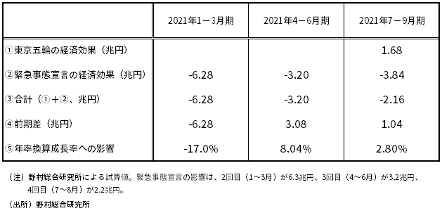 しかし、第3回緊急事態宣言によって既に4-6月期には経済損失が生じている。他方、7-9月期には東京五輪のプラスの経済効果が加わる。東京五輪と緊急事態宣言の影響のみを取り出して計算すると、それらは7-9月期の実質GDP成長率を4-6月期比年率で+2.8%押し上げる計算となる(図表2)。