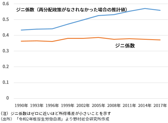 他方、租税制度、社会保障制度による所得再分配機能の効果がない場合には、ジニ係数は上昇傾向にあったことも示されている。つまり、既存の諸制度によって所得格差の拡大は抑えられ、むしろ縮小傾向がもたらされてきたのである。