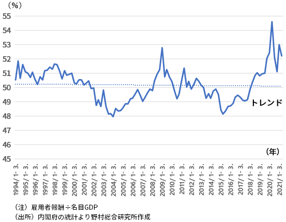 名目雇用者報酬を名目GDPで割る形で、簡便的に労働分配率を算出したのが(図表1)である。労働分配は景気循環の影響を受けるが、1994年以降30年近くの労働分配率はほぼ横ばいで推移してきた。そして最新の2021年4-6月期の数値は52.2%と、トレンド線の水準を大きく上回っている。