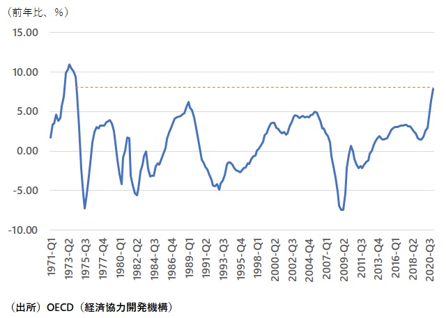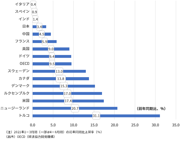 改めて世界の住宅価格の動向を概観してみよう。経済協力開発機構(OECD)のデータによると、加盟国の住宅価格は、2021年1-3月期に前年同期比+9.5%まで上昇している(図表1)。これは、1989年以来30数年振りの水準だ。しかも、昨年来の上昇ペースの加速は非常に顕著である。