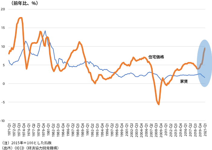 他方、新型コロナウイルス問題を受けて、世界的に家賃の上昇率は顕著に低下した。景気情勢の悪化による住宅需要の一時的な低下を反映したものだろう。そうした中、住宅価格はそれとは逆方向に急上昇しているのである(図表2)。