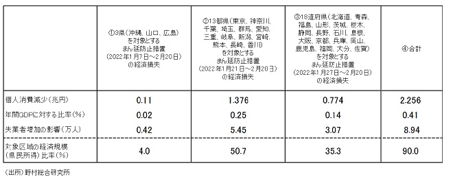 18都府県への同措置適用は、7,740億円の経済損失(個人消費減少)となる計算だ。これは、1年間の名目GDPの0.14%に相当し、3.1万人の失業者を生む。既に同措置が適用されている16都県(いずれも適用期間が2月20日まで延長されると想定)と合計すると、経済損失は2兆2,560億円に及ぶ。これは、1年間の名目GDPの0.41%に相当し、8.9万人の失業者を生む計算だ(図表)。