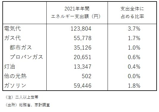 ガソリンと灯油の支出が家計全体の消費に占める比率は2.2%であるが、電気代とガス代の比率は5.4%と、その2.5倍にも達する(図表2)。ガソリンと灯油の支出は、エネルギー関連支出全体の29%と3分の1未満にとどまるのである。