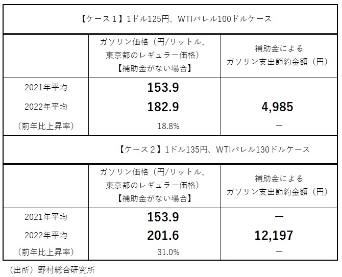 第1のケースは、今後WTI原油先物価格が1バレル100ドル、ドル円レートが125円で推移するものだ(今年5月~12月)。現状程度の価格が維持されるケースである。第2のケースは、原油価格の上昇と円安がさらに進むもので、WTI原油先物価格が1バレル130ドル、ドル円レートが135円で推移するものだ(今年5月~12月)。当然ではあるが、海外で原油価格が上昇する程、そして円安が進むほど、日本の原油輸入価格は上昇し、国内のガソリン価格は高くなる。
