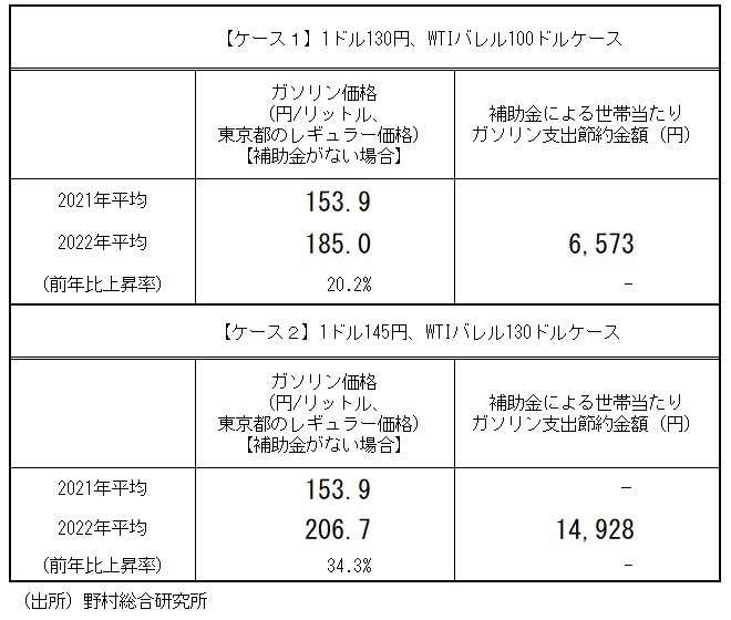 第1の原油価格の高騰対策の景気浮揚効果を、5月以降、為替レートが1ドル130円、WTI原油先物価格が1バレル100ドルという現状の水準が維持されるケース1(ベースシナリオ)と、さらに円安と原油高が進み、1ドル145円、WTI原油先物価格が1バレル130ドルとなるケース2(リスクシナリオ)でそれぞれ、ガソリン価格(補助金がない場合)を算出した(図表1)。