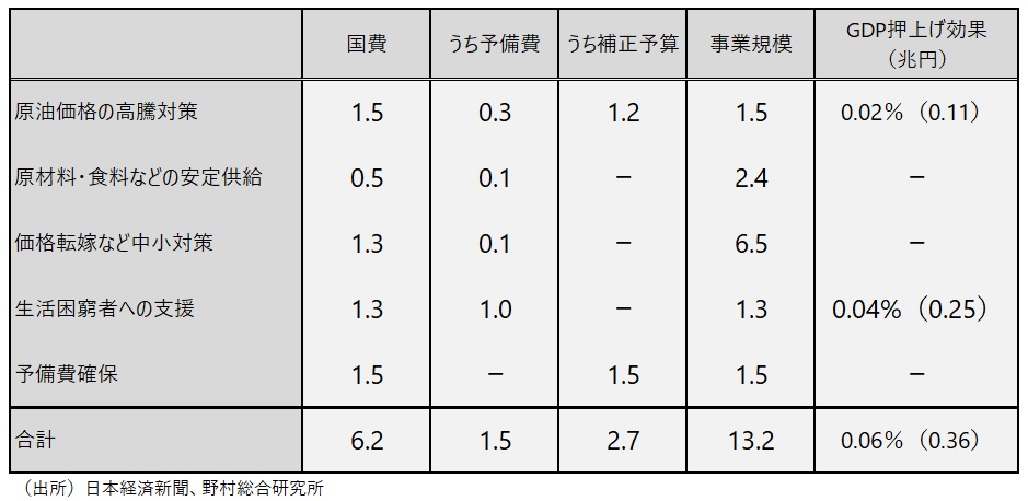 1)原油価格の高騰対策は、予備費から0.3兆円、補正予算から1.2兆円賄われ、合計で1.5兆円となる。4)生活困窮者への支援は、予備費から1.0兆円、本予算から0.3兆円があてられる。